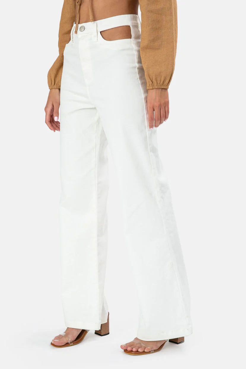 These white jeans are not your average everyday pair of jeans. With a waist cut out, these jeans are a lot more fashionable and fun to wear. Flare leg jeans in a high waisted fit, with sick cut-out detail at the waist. Get groovy, babe!
